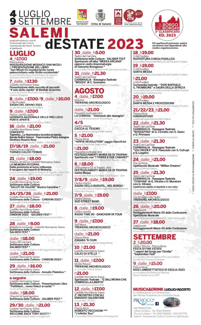 “Salemi ha avuto la capacità di ritagliarsi uno spazio autorevole nel panorama del jazz – affermano Venuti e l’assessore al Turismo Vito Scalisi -. ‘Welcome Back Tony Scott’, anche quest’anno, richiama nella nostra città artisti di altissimo livello. La Settimana delle Culture, però, non si ferma alla musica ma porta con sé altre importanti conferme, come il ‘CineKim’ e il ‘Salìber Fest’, e novità interessanti”. Il calendario delle iniziative culturali, infatti, si aprirà lunedì 24 luglio con la mostra di cartoline d’epoca ‘Saluti da Salemi’, curata da Giuseppe Lodato, alle 19, presso il castello. Sabato 29 luglio, alle 16, annullo filatelico al castello a cura di Poste Italiane, e a seguire la presentazione del libro ‘Futtitinni…comu finisci su cunta’, di Lodato.