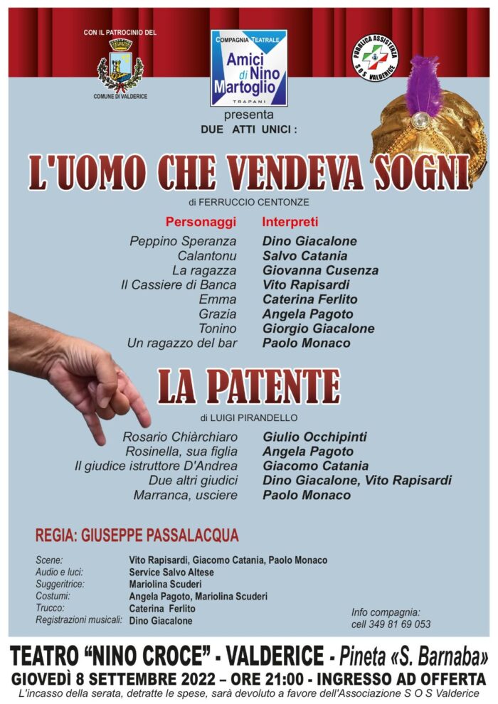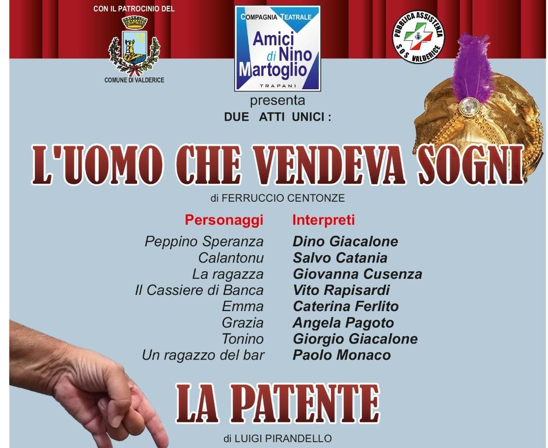 Domani sera, giovedì 8 settembre, dalle ore 21 in poi, una serata di teatro amatoriale con un invito rivolto a tutti per fare anche una buona azione; tutto questo al Teatro “On. Nino Croce” di San Barnaba a Valderice dove la Compagnia Teatrale “Amici di Nino Martoglio“, con il patrocinio del Comune di Valderice, presenterà due atti unici “L’uomo che vendeva Sogni” di Ferruccio Centonze e “la Patente” di Luigi Pirandello. Il ricavato della serata sarà devoluto all’ Associazione Onlus di Pubblica Assistenza “SOS Valderice” che tanto si sta impegnando nella lotta agli incendi sul territorio. “Siete tutti invitati a diffondere l’invito ai vostri amici e conoscenti – scrivono gli organizzatori dell’appuntamento in una nota giuntaci in redazione – a partecipare per trascorrere due ore in allegria e contribuire per un più alto fine sociale.“