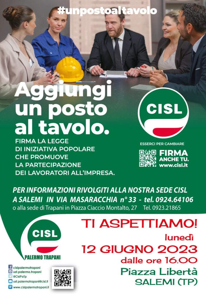 Partirà da Salemi per il territorio di Trapani la campagna di raccolta firme sulla proposta di legge di iniziativa popolare della Cisl Nazionale, che prevede la partecipazione dei lavoratori alla gestione delle aziende, in attuazione dell’articolo 46 della Costituzione. Il primo banchetto della Cisl Palermo Trapani nella provincia trapanese si troverà il prossimo lunedì 12 giugno dalle ore 16 in piazza Libertà a Salemi. La proposta di legge di iniziativa popolare prevede dunque la partecipazione dei lavoratori in azienda in tutte le forme, gestionale, finanziaria, organizzativa e consultiva. Fra i punti principali: quello relativo ai contratti collettivi che possono prevedere, su base volontaria, l’accesso dei lavoratori al possesso di azioni o di quote di capitale dell’impresa stessa, attraverso l’adozione di piani di partecipazione finanziaria dei lavoratori dipendenti. Il testo prevede fra l’altro incentivi e sgravi fiscali per le imprese che attuino piani di partecipazione e piani di consultazione attraverso la formazione degli organismi paritetici, con obblighi di formazione dei lavoratori e degli amministratori coinvolti nella partecipazione gestionale e consultive e anche un meccanismo premiale per le imprese che coinvolgono i lavoratori. Fra i possibili vantaggi per i lavoratori dunque: aumenti salariali, qualità e stabilità del lavoro, maggior produttività e competitività, zero delocalizzazioni, piu investimenti, una piena coesione sociali, e rientro delle imprese dall’estero. “Riteniamo che questa legge – spiega il segretario generale Cisl Palermo Trapani La Piana – sia la strada da percorrere per garantire un lavoro di qualità e soprattutto gratificante sotto diversi punti di vista per tanti lavoratori. Un vantaggio per aziende e dipendenti, perché quella della Partecipazione è una opportunità che raccoglie tutte le grandi sfide di questo tempo. Il mondo del lavoro può così diventare protagonista del futuro dell’economia delle nostre città e rilanciamo anche da Palermo, territorio da troppo tempo in crisi, l’appello alla politica affinché sostenga questa iniziativa di legge e ai cittadini tutti, lavoratrici lavoratori ma anche tutti i pensionati, affinché giungano ai nostri banchetti per far si che con la loro firma possa essere sempre più vicino quel cambiamento nel mondo del lavoro atteso da anni”. La raccolta durerà sei mesi, nelle prossime settimane anche i banchetti a Trapani e negli altri comuni del territorio.