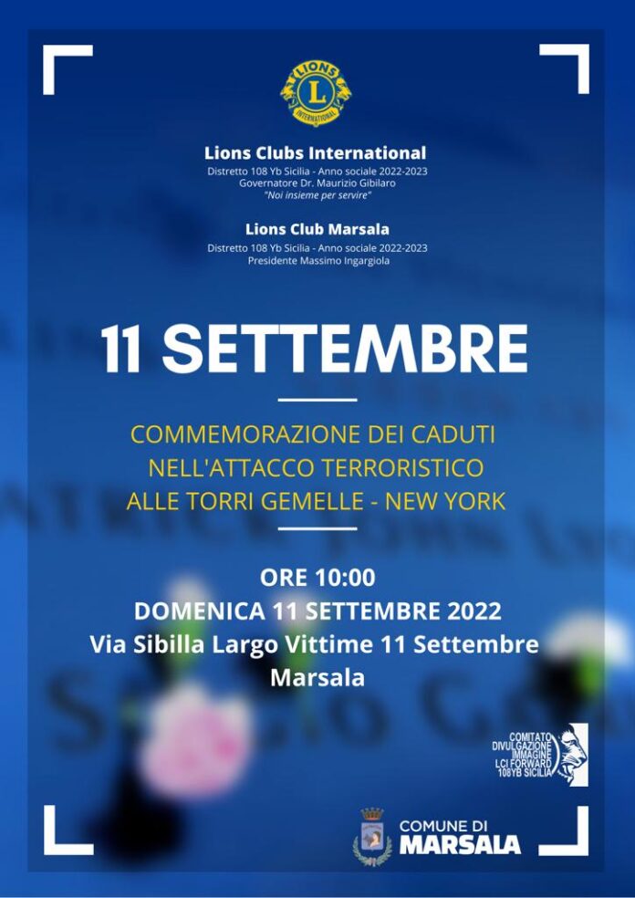 Domenica prossima ricorre il 21° Anniversario della strage di New York. Le migliaia di Vittime dell’attacco terroristico dell’11 Settembre 2001 – con due aerei schiantatisi sulle Torri Gemelle – anche quest’anno saranno commemorate dall’Amministrazione Comunale e dal Lions Club di Marsala. Il sindaco Massimo Grillo e il presidente del Lions Massimo Ingargiola – unitamente agli altri rappresentanti istituzionali e del Club – si ritroveranno alle ore 10:00 in via Sibilla, nel Largo Vittime 11 Settembre dove è posto il Cippo dedicato.
