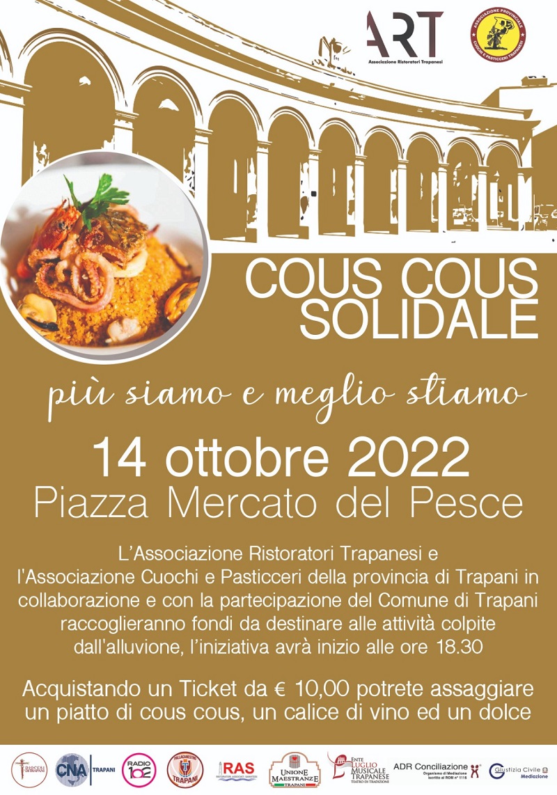 Il mondo della ristorazione e dei cuochi e pasticceri trapanesi, come una grande squadra, si mobilita per sostenere le attività commerciali colpite dai numerosi episodi di alluvione che hanno interessato in queste settimane la città di Trapani. “Cous Cous solidale” è il nome dell’evento organizzato da ART – Associazione Ristoratori Trapanesi e dall’Associazione Provinciale di Cuochi e Pasticceri Trapanesi, che si svolgerà il 14 ottobre, a partire dalle ore 18.30 in Piazza Mercato del Pesce a Trapani.