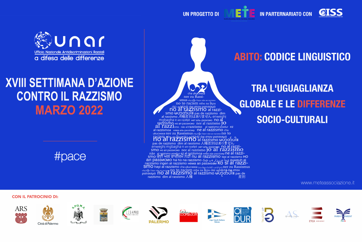 Nell’ambito della “XVIII Settimana di Azione contro il Razzismo” promossa con Avviso Pubblico dall’UNAR – Presidenza del Consiglio dei Ministri, Dipartimento per le Pari Opportunità, Ufficio per la promozione della parità di trattamento e la rimozione delle discriminazioni fondate sulla razza o sull’origine etnica, METE ONLUS e CISS Ong, in partenariato, sono state ammesse con il progetto: “ABITO: codice linguistico tra l’uguaglianza globale e le differenze socio-culturali”. La settimana è prevista dal 15 al 21 marzo 2022: diverse le iniziative calendarizzate, sia in presenza che online.