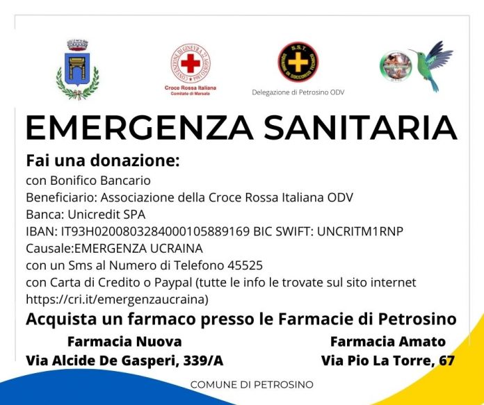 Partirà domani mattina a Petrosino la raccolta straordinaria di farmaci per l’emergenza umanitaria in Ucraina. I cittadini potranno fare le proprie donazioni presso le due farmacie presenti sul territorio comunale: Farmacia Amato in via Pio La Torre 67 e Farmacia Nuova in via Alcide De Gasperi 339/A. In entrambe le farmacie l’accoglienza sarà assicurata dai volontari della Croce Rossa Italiana (comitato di Marsala), dell’organizzazione “S.T.T. – Squadre di Soccorso Tecnico” e dell’associazione Co.Tu.Le.Vi, che hanno aderito all’iniziativa lanciata dall’Amministrazione comunale di Petrosino.
