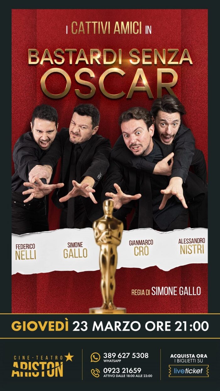 Anche questo non rientra nella stagione teatrale ufficiale ma – anche in questo caso – sarà un evento da non perdere per chi desidera trascorrere una serata all’insegna della leggerezza e delle risate. Giovedì, 23 Marzo 2023, la compagnia “CATTIVI AMICI” porterà in scena, infatti, lo show dal titolo “BASTARDI SENZA OSCAR” che non è una commedia ma molto di più: la massima espressione artistica di quattro attori che in scena interpretano tutti i film, le serie e le opere teatrali più importanti che fino ad ora erano solo un sogno. Uno spettacolo esilarante, a tratti surreale, con toni di suspence e demenzialità. Una comicità a tutto tondo senza tralasciare alcune chicche e trucchi del mondo dello spettacolo che non tutti conoscono e che incuriosiranno lo spettatore.