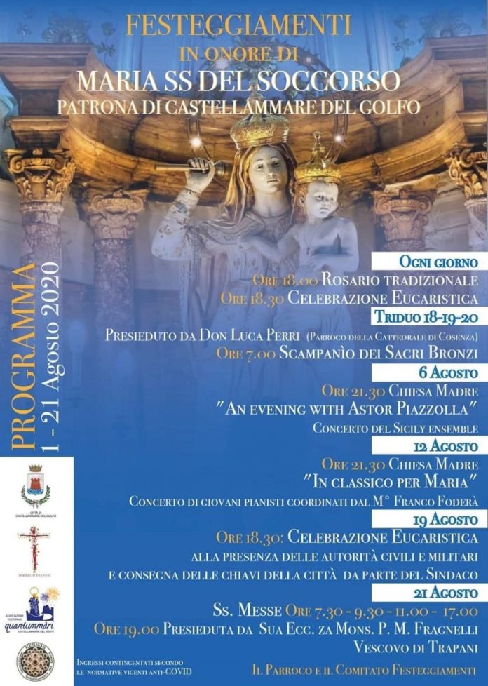 Il 21 agosto alle ore 21,30, in chiesa Madre, celebrazione eucaristica in onore di Maria Santissima del Soccorso presieduta dal vescovo di Trapani Pietro Maria Fragnelli:sarà purtroppo anche l’ultima celebrazione per i festeggiamenti della patrona con don Fabiano Castiglione che, dopo 13 anni di eccellente guida, lascia la città di Castellammare del Golfo.