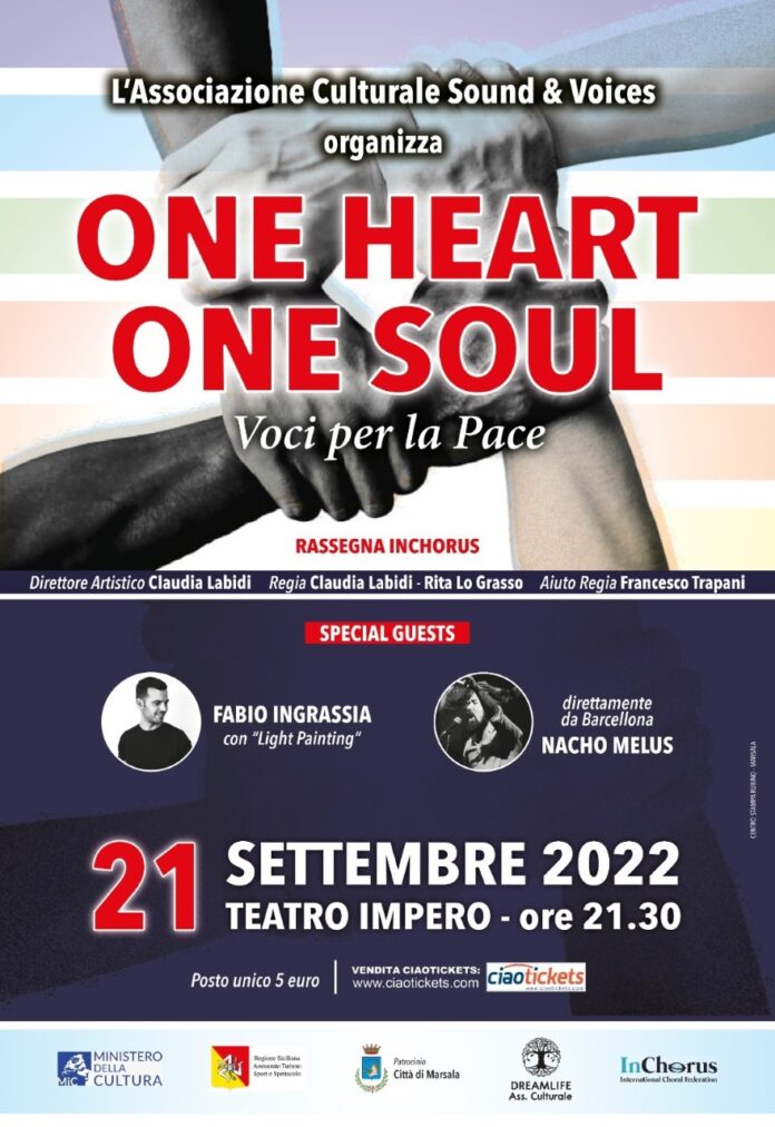 Organizzato dall’Associazione “Sound e Voices” andrà in scena, mercoledì 21 settembre prossimo, alle ore 21:30, al Teatro Impero lo spettacolo musicale “One Heart one Soul”. La manifestazione che si tiene nella “Giornata Internazionale della Pace” si avvale del patrocinio dell’Amministrazione comunale di Marsala.