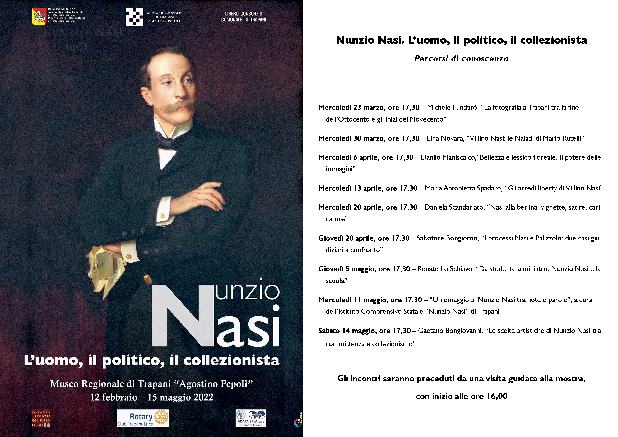 Obiettivo dei nove incontri, l’ultimo dei quali si svolgerà il 14 maggio, è quello di approfondire, attraverso il contributo di studiosi, storici e storici dell’arte, aspetti particolari della vita sociale e culturale che animavano la città di Trapani durante la fine dell’800 e i primi anni del 900, cercando di cogliere gli umori, le tendenze, il clima generale in cui operò Nunzio Nasi, l’eclettico intellettuale trapanese che animò la vita culturale del periodo, e di cui la mostra approfondisce la vicenda umana, l’esperienza politica, il ruolo di raffinato intellettuale e collezionista d’arte.