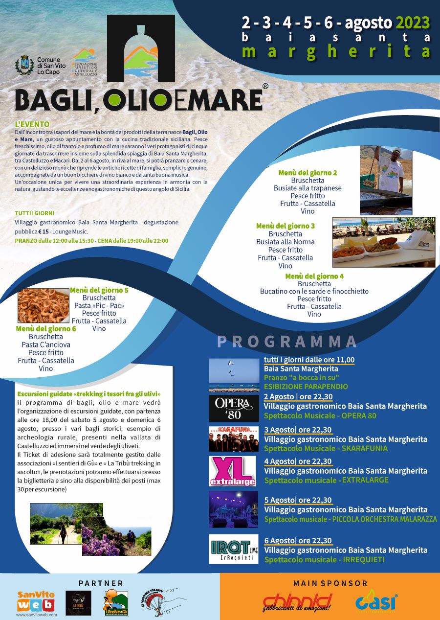 La rassegna “Bagli, Olio e Mare” rappresenta un’occasione per valorizzare le eccellenze locali e promuovere la cultura e il territorio di San Vito lo Capo e della provincia di Trapani. La manifestazione è organizzata dall’Associazione Turistica Culturale “Castelluzzo” con il contributo del Comune di San Vito lo Capo.