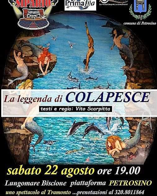 Arte e natura si fondono per dare vita ad uno spettacolo fra gli scogli nel magico tramonto d’estate al lungomare Biscione di Petrosino. Con il patrocinio del Comune di Petrosino, la Compagnia Teatrale Sipario in collaborazione con la Events&Service e con la cura tecnica di Primafila service vi propone uno spettacolo unico nel suo genere, “La leggenda di Talassa e Colapesce”. Unici obblighi sono la prenotazione e la mascherina per rispettare il protocollo di sicurezza Covid poiché l’ingresso è gratuito. Per info e prenotazioni chiamare al num in locandina. Pochi i posti disponibili. L’appuntamento è in programma oggi alle ore 19.