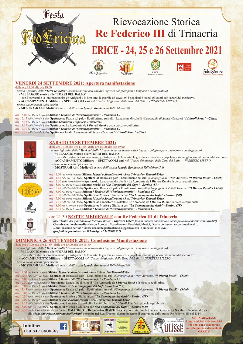 Prenderà il via venerdì 24 settembre la settima edizione della Festa Federicina, la manifestazione rievocativa dell’arrivo di Re Federico III di Trinacria/Sicilia e la moglie Eleonora D’Angiò, nell’antico borgo di Erice. La manifestazione si svolgerà in tre giornate e continuerà fino a domenica 26 settembre con un programma ricco di eventi presso le “Torri del Balio” e per le vie del Borgo. La manifestazione è ideata e programmata dall’Associazione “Trapani: tradumari&venti” con il Gruppo Medievale “MonteSanGiuliano – Erice”, i Musici e gli Sbandieratori “Real Trinacria” Trapani-Erice e con il patrocinio del Comune di Erice e della Federazione Storica Siciliana.