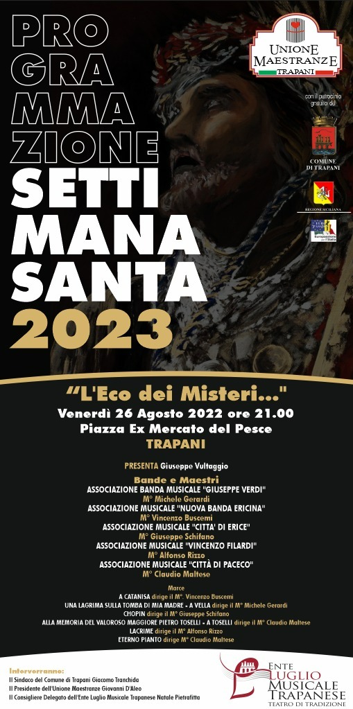 Si tratta di un concerto volto a promuovere l’edizione 2023 dei riti della Settimana Santa e della Processione dei Misteri del Venerdì Santo a Trapani, in un periodo sicuramente inconsueto ma di maggiore afflusso turistico. Cinque bande del territorio, dirette dai rispettivi maestri, attireranno l’attenzione di turisti e residenti. In particolare, parteciperanno le bande musicali: “Giuseppe Verdi”, la “Nuova Banda Ericina”, “Città di Erice”, “Vincenzo Filardi”, “Città di Paceco”.