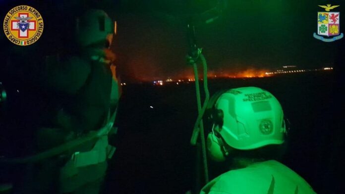 Soccorso Alpino e Speleologico Siciliano e 82° Csar dell’Aeronautica Militare in azione la notte scorsa per mettere in sicurezza un gruppo di turisti rimasti intrappolati dalle fiamme che hanno devastato anche il Trapanese.