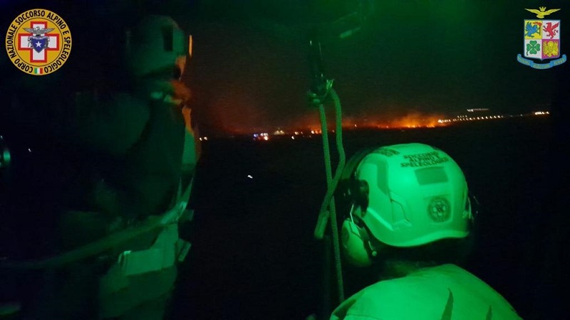 Allertati dalla Capitaneria di porto di Trapani che stava evacuando via mare i villeggianti di Calampiso ma che aveva perso i contatti con un gruppo nella zona di Tonnara del Secco, a San Vito Lo Capo, i tecnici del Sass hanno raggiunto l’aeroporto militare di Trapani Birgi per essere imbarcati su un elicottero HH 139B dell’82° centro Csar. Raggiunta la zona dell’intervento, nonostante le altissime temperature e le fiamme che minacciavano di allargarsi, il velivolo ha sorvolato la costa in cerca del gruppo formato da 15 persone (5 uomini, 5 donne e 5 bambini). Li hanno invididuati a qualche centinaio di metri dalla costa. A quel punto, vista la situazione di estremo pericolo che ne impediva il recupero, l’elicottero è atterrato in uno spiazzo libero. Sono sbarcati i due tecnici del Soccorso Alpino e un elisoccorritore dell’Aeronautica militare, hanno raggiunto i turisti, li hanno rifocillati e accompagnati a piedi fino alla costa, per essere messi in salvo dai mezzi della Capitaneria.