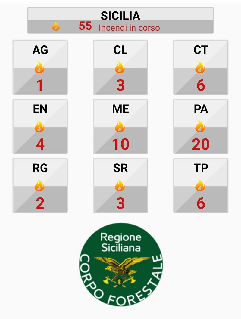 Le fiamme sono divampate per tutta la notte in tutte le province. Sono 55 gli incendi ancora in atto nell’Isola. Il forte vento di scirocco rende impossibile a canadair ed elicotteri operare. In volo soltanto un Canadair impegnato a contrastare le fiamme nella zona di Altofonte. In azione ci sono soltanto i mezzi di terra. La situazione più grave resta sempre quella delle zone attorno a Palermo, dove sono giunte anche squadre di volontari dalle province di Agrigento ed Enna. Nella notte sono state evacuate abitazioni a San Martino, Monreale, Altofonte, Boccadifalco, Mondello e Pizzo Sella, Poggio Ridente, a Inserra, Raffo Rosso, a Capaci e nella zona attorno all’aeroporto di Punta Raisi. Situazione critica anche nel Trapanese, a San Vito lo Capo, nel Messinese e a Enna.