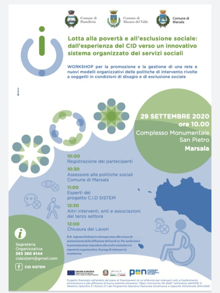 Si terrà il prossimo martedì 29 settembre 2020 alle 10, presso il Complesso Monumentale San Pietro il workshop di presentazione del lavoro realizzato a Marsala nell’ambito del progetto C.I.D. – S.I.S.TE.M. che prevede la promozione e la gestione di reti e nuovi modelli organizzativi delle politiche di intervento rivolte a soggetti in condizioni di disagio e di esclusione sociale.