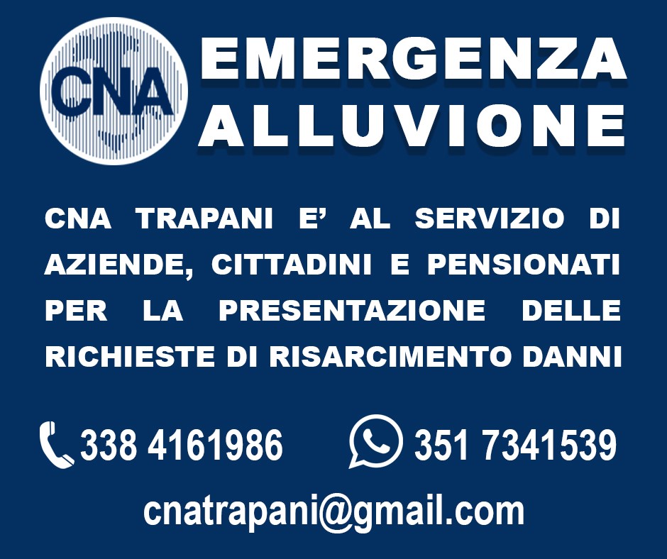 Nell’attesa che l’allerta meteo rientri, per avere il supporto di CNA Trapani nell’elaborazione e invio delle istanze di risarcimento danni, è possibile scrivere una email a cnatrapani@gmail.com o, in alternativa, inviare un messaggio whatsapp al numero 338- 4161986, telefono 351- 7341539.