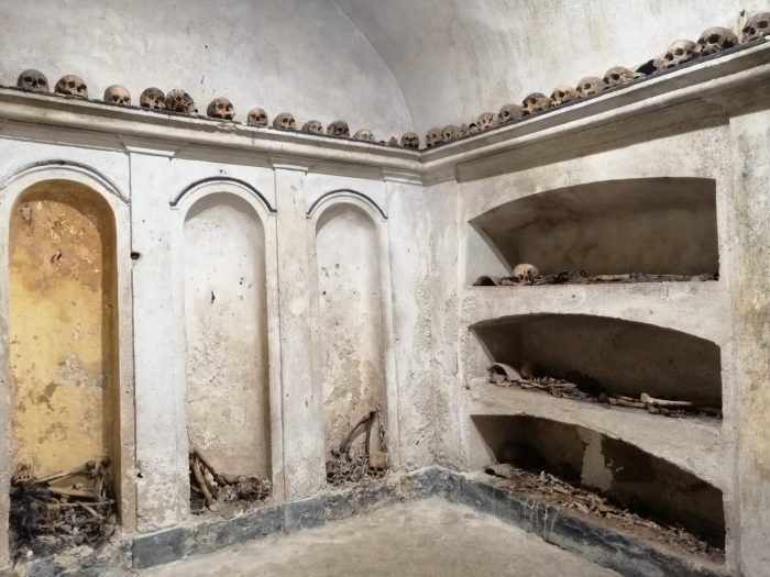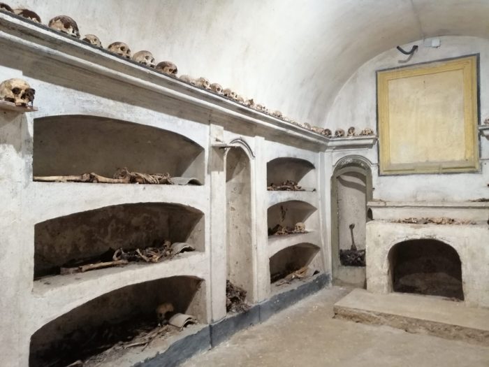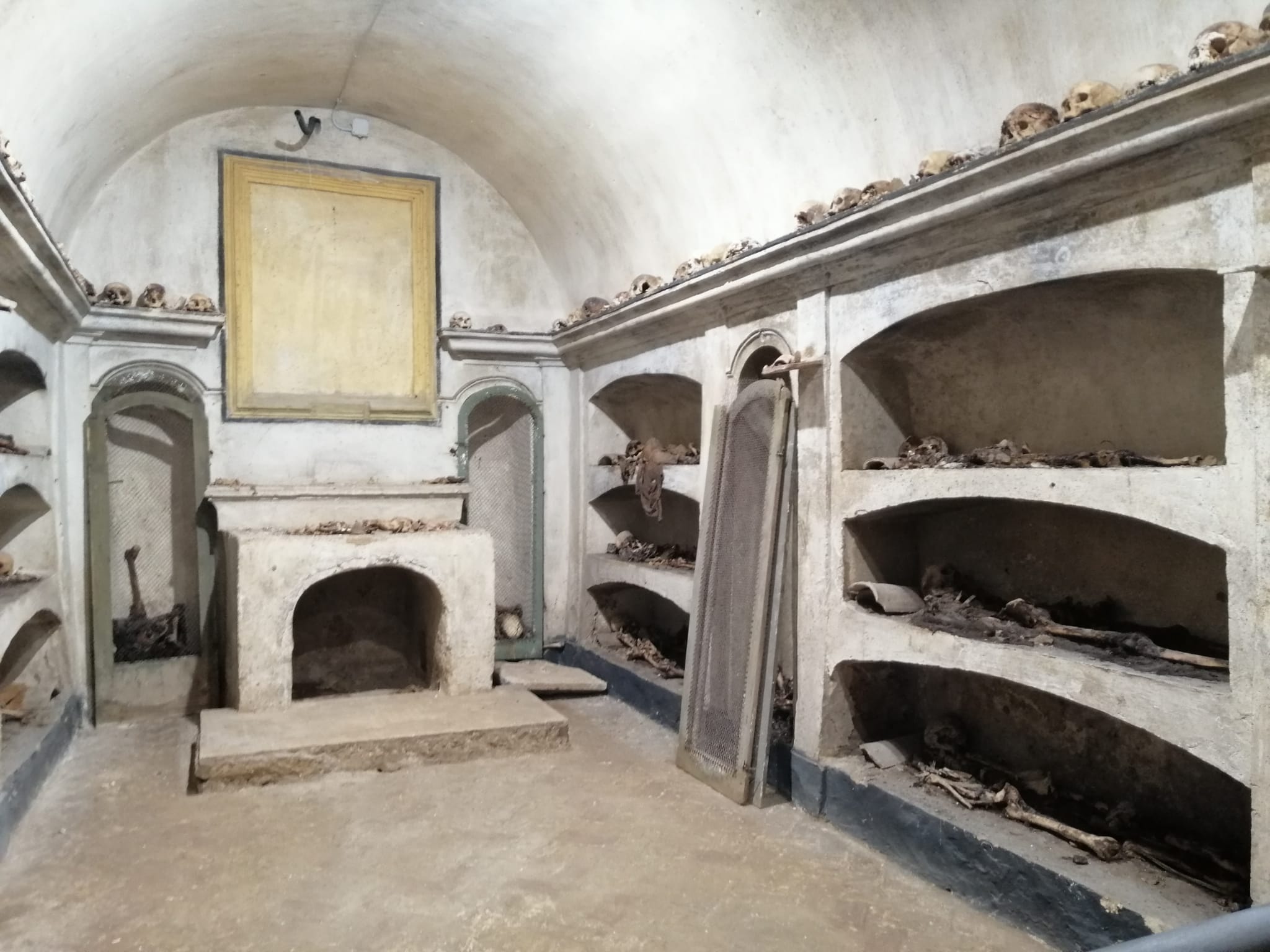Nella cripta, molto semplice e con le pareti bianche, ancora oggi si possono vedere i resti del corpi sepolti nelle nicchie, sia verticali che orizzontali, scavate nella roccia. Sopra le sepolture, in una cornice, ci sono dei teschi, che ricordano i grani della corona di un Rosario. Al centro della cripta ci sono le due botole che portano ad un ossario sottostante.