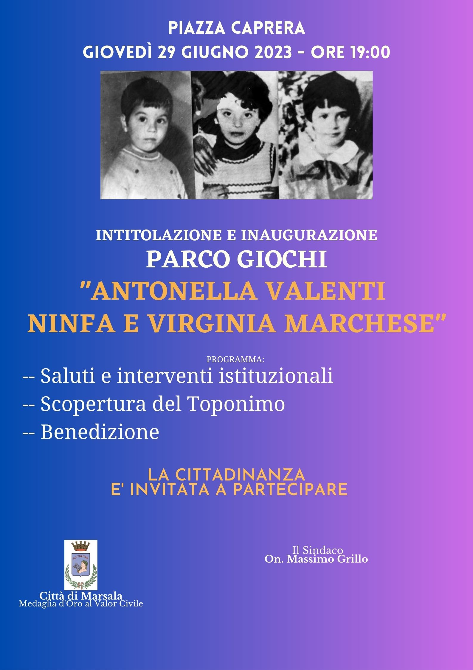 L’Amministrazione Grillo giovedì prossimo, 29 giugno, alle ore 19:00, intitolerà un luogo pubblico a Ninfa e Virginia Marchese e ad Antonella Valenti. Sono le vittime del cosiddetto “mostro di Marsala”, rapite il 21 Ottobre 1971 e poi ritrovate morte: Antonella in una scuola abbandonata; le sorelline Ninfa e Virginia in una ex cava di tufi. Alle tre ragazzine, dopo oltre 50 anni, verrà intitolato lo spazio a verde di piazza Caprera che assumerà la denominazione di Parco Antonella Valenti, Ninfa e Virginia Marchese. La cittadinanza è invitata a partecipare