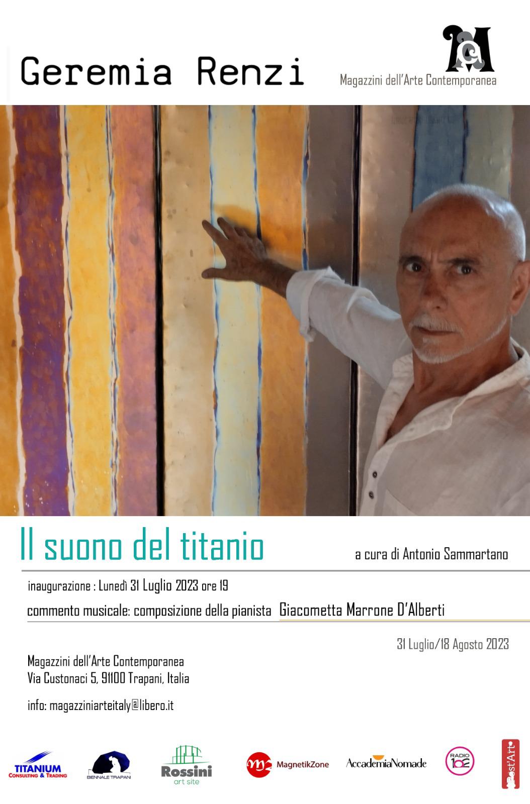 I Magazzini dell’Arte Contemporanea presentano le opere di Geremia Renzi. In mostra le ultime opere dell’artista realizzate su titanio, materiale dalle particolarissime qualità che offre nuove possibilità di sperimentazione artistica. Il progetto artistico di Renzi prevede anche la collaborazione con la pianista Giacometta Marrone D’Alberti che con le sue composizioni creerà un connubio tra arte visiva e musica. L’evento si terrà lunedì 31 luglio ai Magazzini dell’Arte (via Custonaci 5 centro storico di Trapani) dalle ore 19 alle ore 22.
