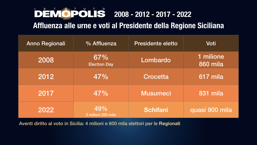 L’astensione è stata anche in questa occasione il dato più caratterizzante nel voto per le Regionali in Sicilia: nonostante l’Election Day, la coincidenza di Elezioni Politiche e Regionali, domenica scorsa ha votato nell’Isola meno di 1 elettore su 2. Appena il 49%. Oltre 2 milioni di siciliani non si sono recati alle urne.