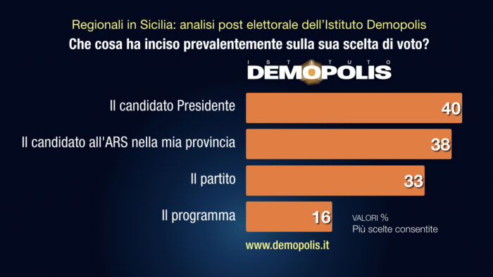 Tra quanti si sono recati alle urne si conferma una tendenza sempre più netta in Sicilia: soltanto una minoranza, poco meno di un terzo, dichiara di aver votato in base alla propria appartenenza di partito. “Ad influire – aggiunge Pietro Vento – è stata soprattutto la scelta del candidato alla Presidenza, dirimente per il 40% di chi si è recato alle urne; ha pesato anche, per il 38% degli elettori, il candidato in lista per l’ARS a livello provinciale: è un dato, quest’ultimo, rivelatosi importante per il Centro Destra e che ha contribuito a favorire, nell’ultima settimana, un’ulteriore crescita del consenso al nuovo Presidente della Regione Renato Schifani”.