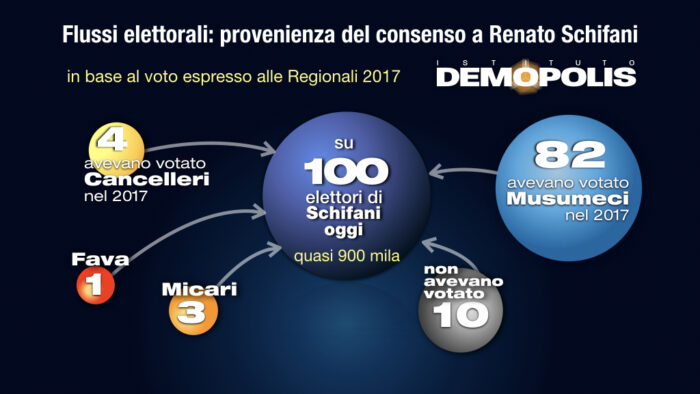 L’analisi dei flussi elettorali conferma gli spostamenti del voto rispetto al 2017. L’Istituto Demopolis ha analizzato la composizione del consenso al nuovo Presidente della Regione: su 100 elettori che hanno scelto oggi Renato Schifani (quasi 900 mila), 82 avevano votato Musumeci alle Regionali del 2017. 4 elettori odierni su 100 di Schifani avevano votato nel 2017 per Giancarlo Cancelleri, 3 per il candidato di Centro Sinistra Mìcari; un segmento di 10 su 100 proviene infine da quanti 5 anni fa non avevano votato.