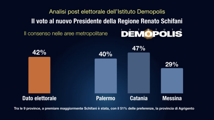 Significative le variazioni del consenso a Renato Schifani nelle 3 aree metropolitane: 40% a Palermo, 47% a Catania, 29% a Messina dove ha pesato la presenza del suo principale competitor Cateno De Luca (che nella provincia dello Stretto ha superato il 50%). Tra le 9 province, a premiare maggiormente Schifani è stata con il 51% delle preferenze, la provincia di Agrigento.