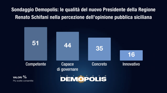 Tra le qualità maggiormente riconosciute dai siciliani al neo Presidente della Regione emergono la competenza e la capacità di governare, legate alla sua lunga esperienza politica. Nella percezione dell’opinione pubblica, Schifani è anche concreto, mentre appena il 16% lo ritiene innovativo.