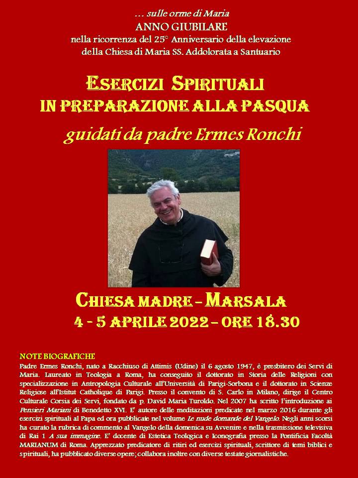 “Riteniamo che Padre Ermes Maria Ronchi sia quanto di meglio si potesse scegliere per guidare gli esercizi spirituali sia dei fedeli della Chiesa Madre che di quelli del Santuario dell’Addolorata – precisano Don Marco Renda e Padre Mariano Narciso, rispettivamente Arciprete di Marsala e rettore della Chiesa che sorge all’ingresso in Città dalla Porta di Mare. E’ chiaro che a questa due giorni non invitiamo a partecipare solo i nostri fedeli ma anche quelli dell’intera comunità religiosa e cristiana della nostra Città. Siamo certi che da questi incontri formativi con Padre Ronchi ne usciremo più forti nello spirito e più coscienti della missione cristiana che ogni uomo di fede è chiamato a svolgere”.
