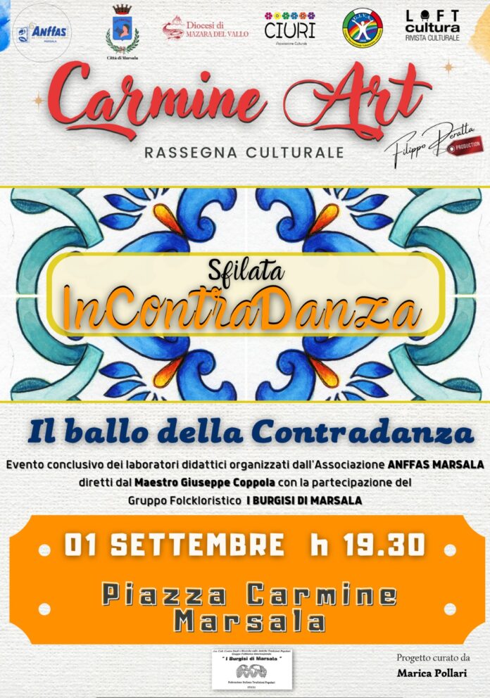 La Rassegna culturale “Carmine Art”, realizzata a Marsala grazie alla collaborazione tra la Diocesi di Mazara del Vallo, l’Associazione Culturale ‘Ciuri’, la rivista on line Loft Cultura e l’associazione GIVA Delegazione Marsala, propone per giovedì 1 settembre due appuntamenti: alle ore 19:30 in piazza Carmine si terrà “InContraDanza”, ossia la conclusione di un laboratorio portato avanti per tutta l’estate a Palazzo Grignani dall’Associazione Anffas Onlus (Associazione Nazionale Famiglie di Persone con Disabilità Intellettiva e/o Relazionale) con il Gruppo Folk “I Burgisi di Marsala”. L’evento si realizza adesso in collaborazione con le associazioni ‘Ciuri’ e GIVA e consiste in sfilata e un ballo della contradanza inclusiva (frutto dei laboratori didattici dei mesi scorsi coordinati dal presidente de “I Burgisi”, Giuseppe Coppola); alle ore 21.30, invece, a cura dell’Associazione Marsala Professione Musica, presieduta da Peppe La Commare, e con la collaborazione di ‘Ciuri’ e GIVA, si terrà l’ultima tappa del progetto “Una città per cantare”, ideato da Filippo Peralta, che prevede la sfida canora tra due colonne portanti della musica italiana: Mina e Lucio Battista. Ragazzi talentuosi del territorio, dunque, interpreteranno le canzoni dei due autori animando piazza Carmine di note in armonia. Il Festival per giovani emergenti si è già svolto il 2 e il 9 agosto con altre sfide musicali che hanno attratto sempre un pubblico numeroso.