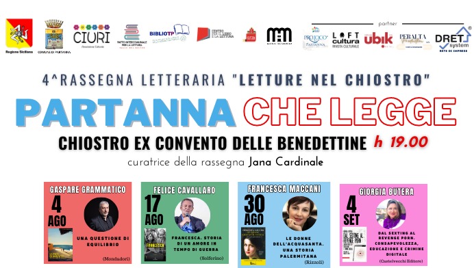 Si chiama “Letture nel Chiostro – Partanna che legge” la 4^ edizione della Rassegna letteraria estiva organizzata dall’Associazione culturale “Ciuri”, presieduta da Filippo Peralta, con il sostegno del Comune di Partanna, che si svolgerà dal 4 agosto al 4 settembre nel Chiostro dell’ex Convento delle Benedettine, dove ha sede la Biblioteca Comunale ‘Francesco Saladino’.